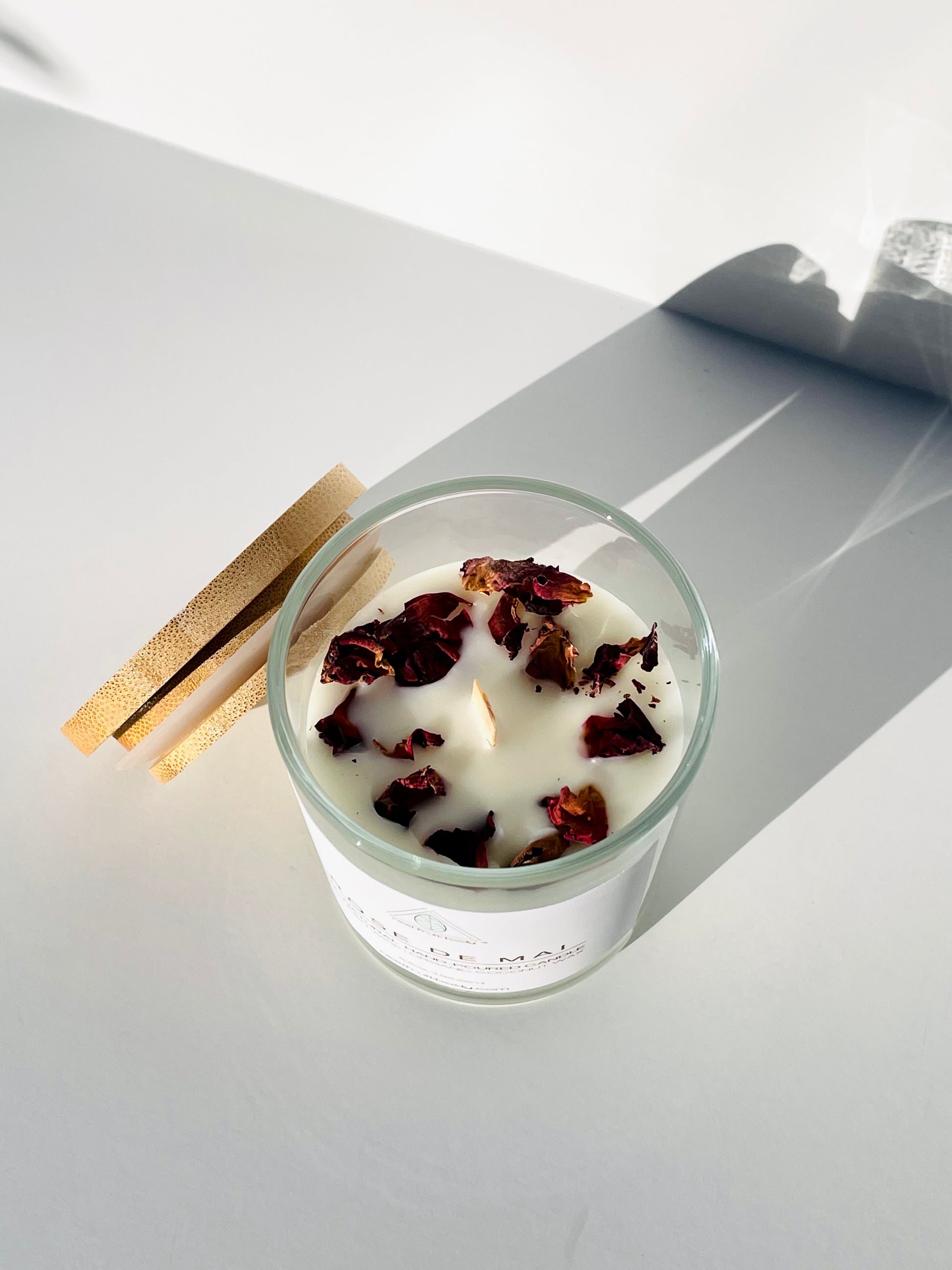 Scent is of 100% Pure Rose De Mai Absolute Oil. Topped with natural dried rose buds and petals.